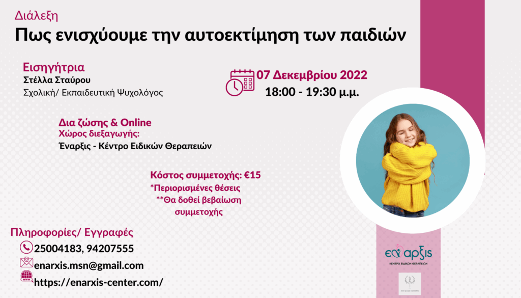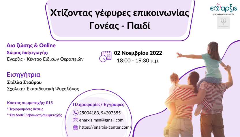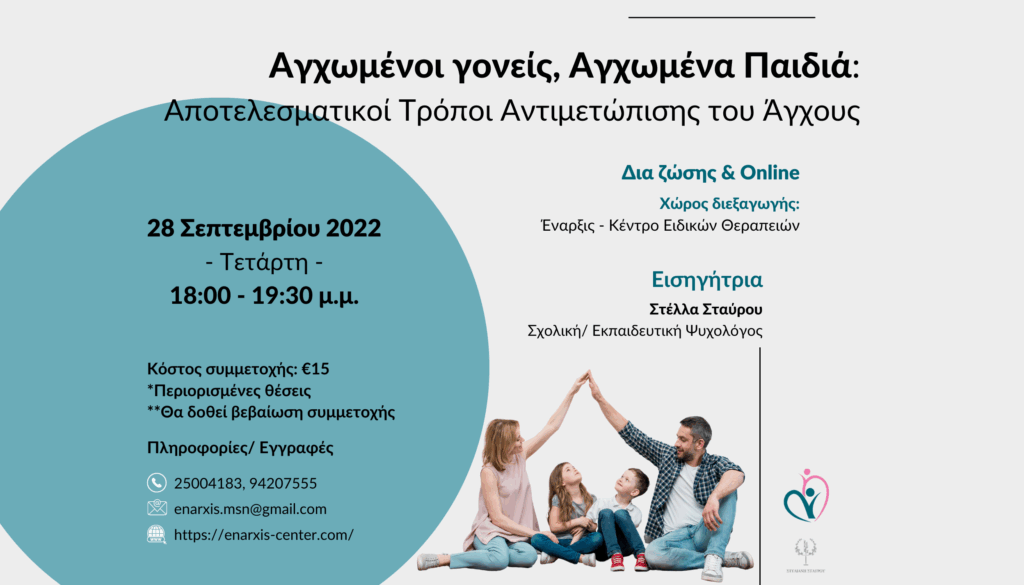 Το γονεϊκό άγχος συνήθως περιλαμβάνει υπερβολική ανησυχία των γονέων όταν έρχονται αντιμέτωποι με συγκεκριμένες καταστάσεις που οδηγούν σε μειωμένες δεξιότητες διαχείρισης και αντιμετώπισης τους. Συνεπώς, η εκμάθηση συγκεκριμένων στρατηγικών διαχείρισης άγχους, θα οδηγήσει στην καλύτερη αντιμετώπιση δύσκολων καταστάσεων. Εισηγήτρια: Στυλιανή Σταύρου,ΒΑ & ΜΑ Σχολική/Εκπαιδευτική ΨυχολόγοςΑρ. Μητρώου:661 Ημερομηνία διεξαγωγής: Τετάρτη 28/09/2022Ώρα: 18:00-19:30 μ.μ.Διοργάνωση και χώρος διεξαγωγής: […]